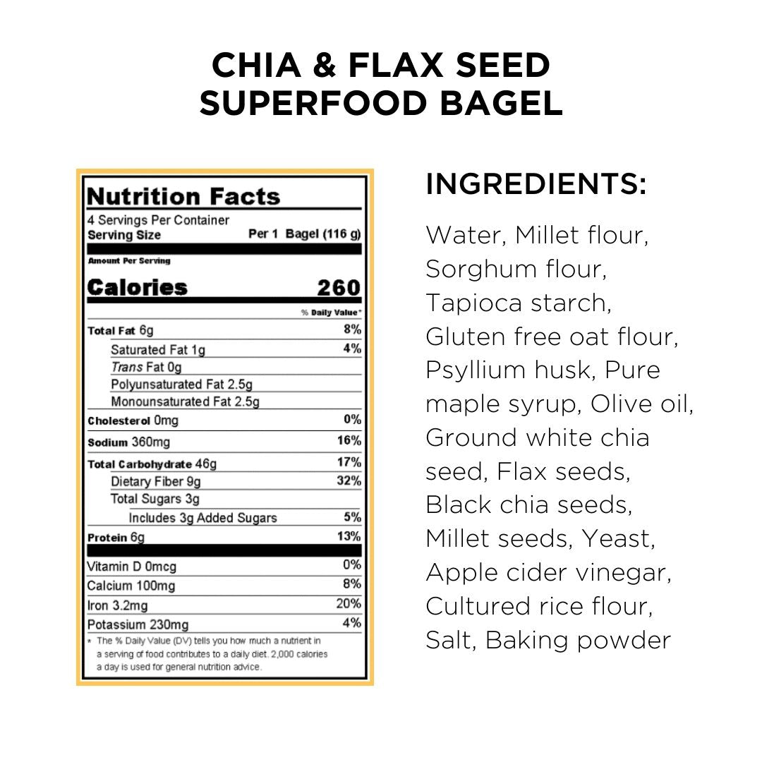 Flax Seeds are a superfood powerhouse with 2X the calcium of milk and 5X more omega-3s than salmon. Combined with superfood Chia seeds delivering 3X the iron compared to spinach, these bagels are the nutrient-dense breakfast of your dreams.