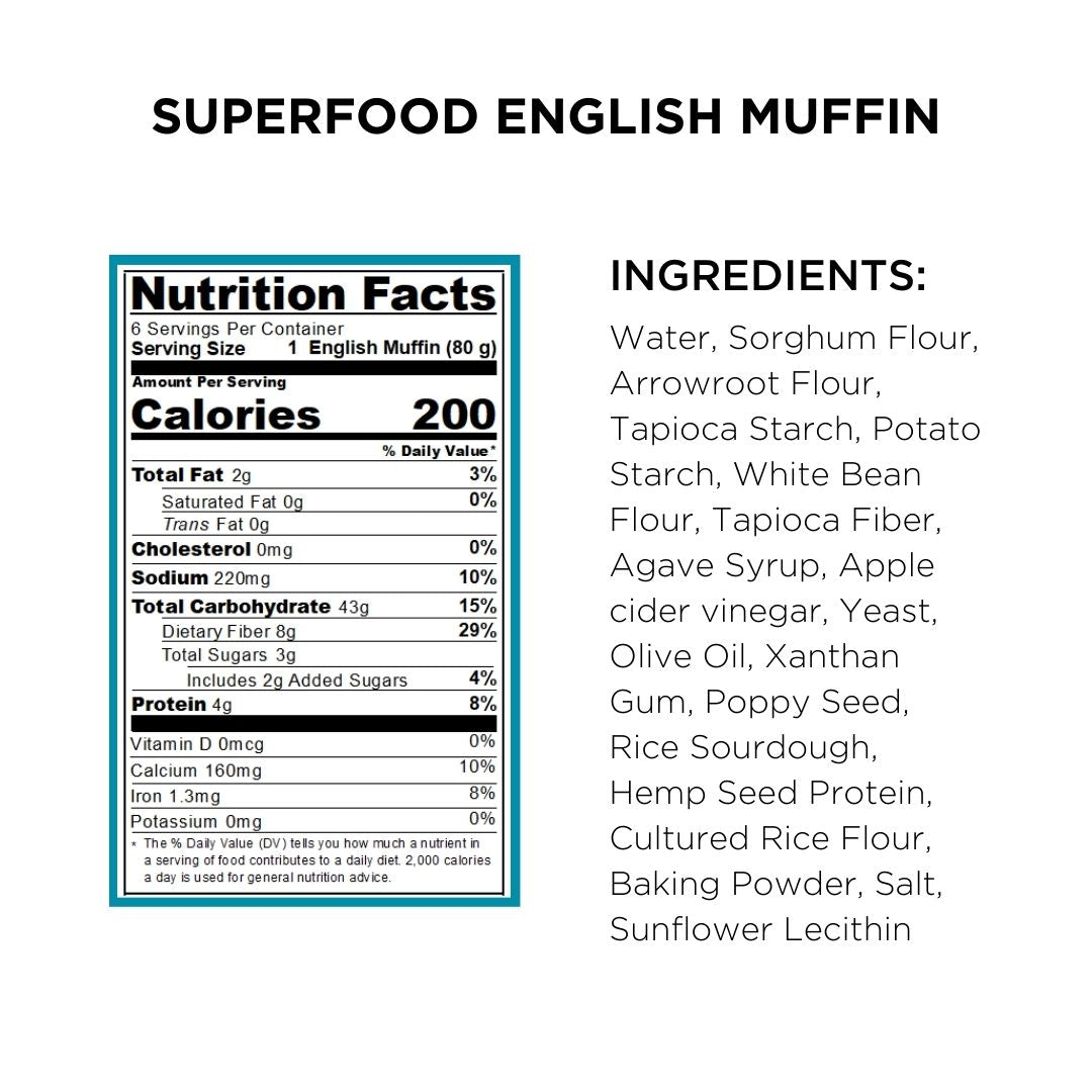 Water, White Bean Flour, Sorghum Flour, Arrowroot Flour, Tapioca Starch, Potato Starch, Tapioca Fiber, Apple cider vinegar, Agave Syrup, Yeast, Olive Oil, Baking Powder, Xanthan Gum, Rice Sourdough, Cultured Rice Flour, Hemp Seed Protein, Poppy Seed, Salt, Sunflower Lecithin