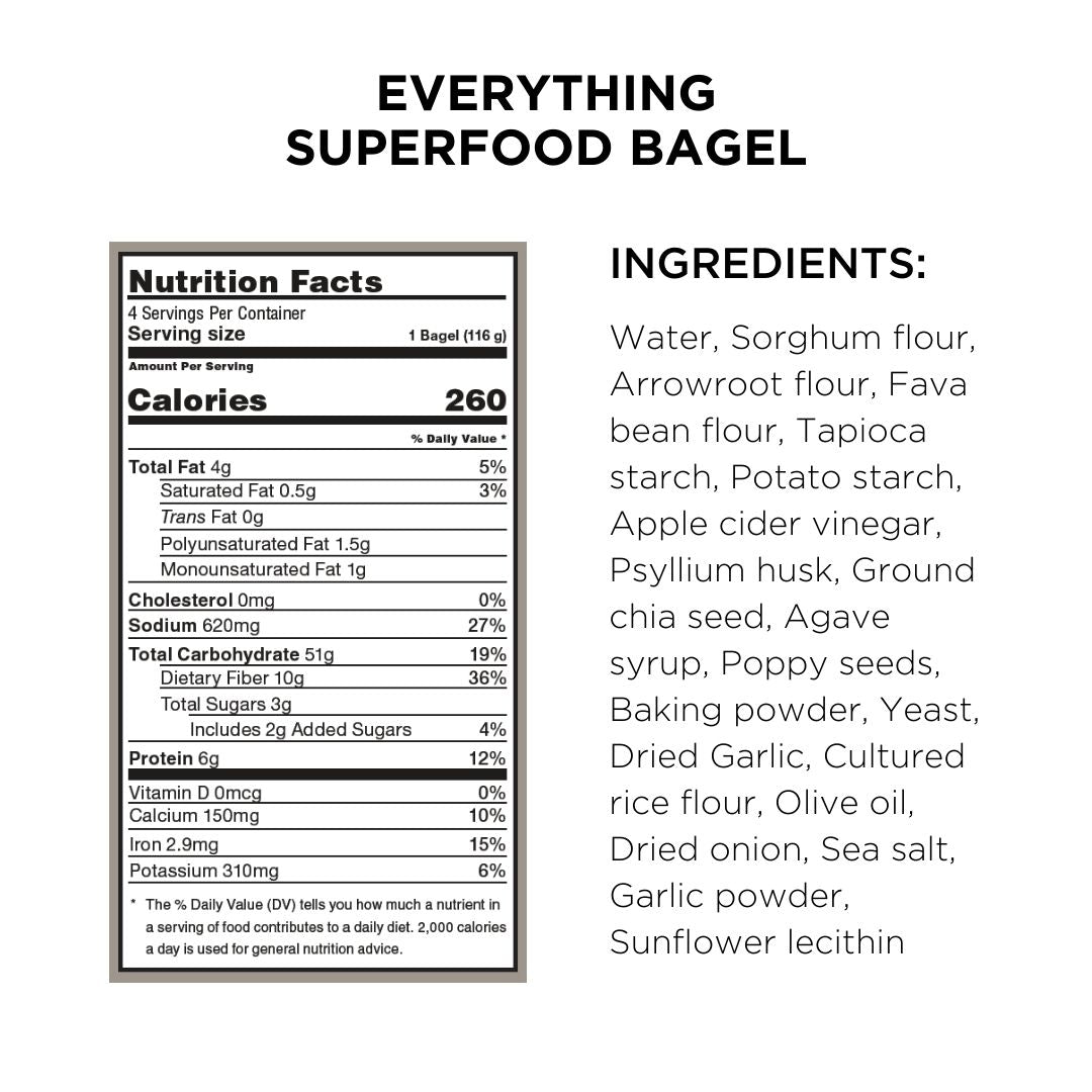 Water, Sorghum flour, Arrowroot flour, Fava bean flour, Tapioca starch, Potato starch, Apple cider vinegar, Psyllium husk, Ground chia seed, Agave syrup, Poppy seeds, Baking powder, Yeast, Dried Garlic, Cultured rice flour, Olive oil, Dried onion, Sea salt, Garlic powder, Sunflower lecithin